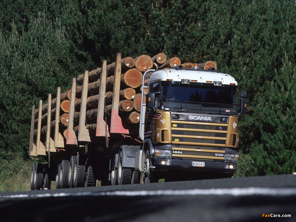 Scania R144G 530 6x4 Timber Truck NZ-spec 1995–2004 wallpapers (1024 x 768)
